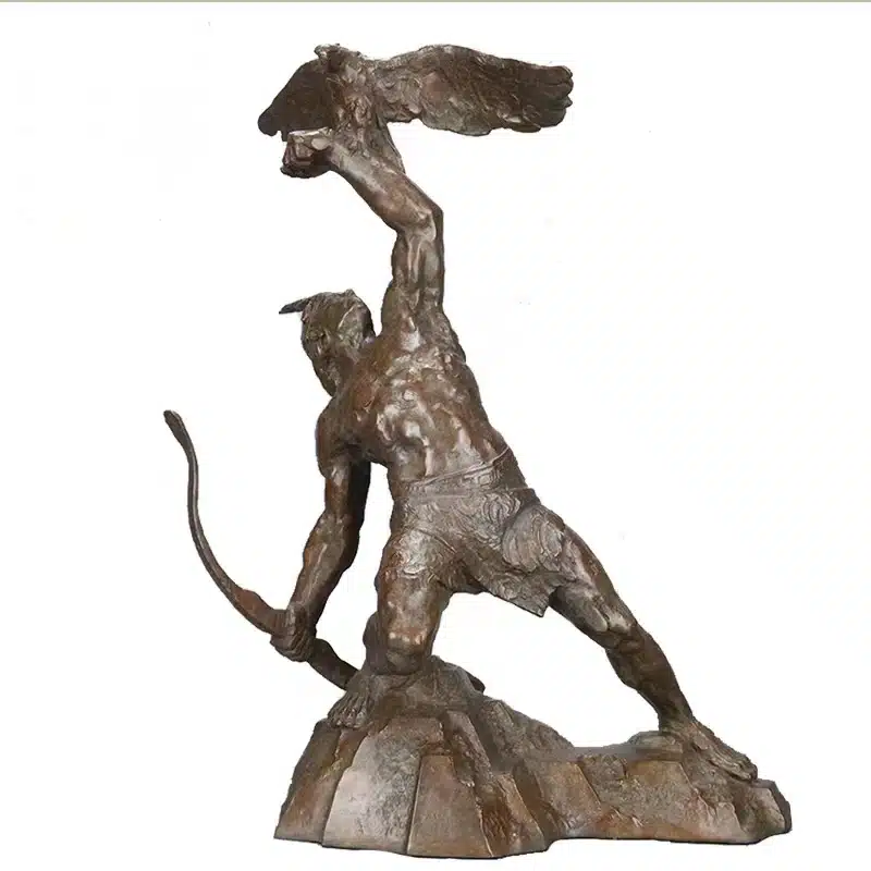 This is the bronze eagle sculptures for sale. This is the hunter and his eagle. The hunter is muscular, with a bow in his hand and an eagle in his other hand. The figure’s body is very tense, and the eagle’s posture is very open.